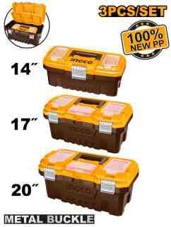 3 Plastic Tool Boxes Set : 14’+17’+20′ 14′ Size : 356mm(14′)*168mm (6.6′)*160mm(6.3′) 17′ Size : 436mm(17′)*220mm (8.7′)*205mm(8′) 20′ Size : 508mm(20′)*296mm (11.7′)*261mm(10.3′) Material: PP Metal buckle High-strength Handle Upper cover with three storage areas Upper cover with scale function Contains 1Pcs plastic tray Packed by label