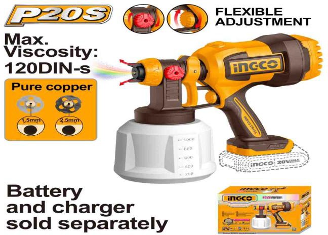 Voltage: 20V Spraying pressure: 0.1-0.2Bar Max.flow: 800ml/min Max.viscosity: 120DIN-s Container capacity: 1000ml Adjustable spray amplitude Include: Container capacity: 1000ml 1 Pcs viscosity measuring cup 1 Pcs nozzle cleaning needle 2 Pcs copper nozzle(1.5/2.5mm) Battery and charger sold separately Packed by color box